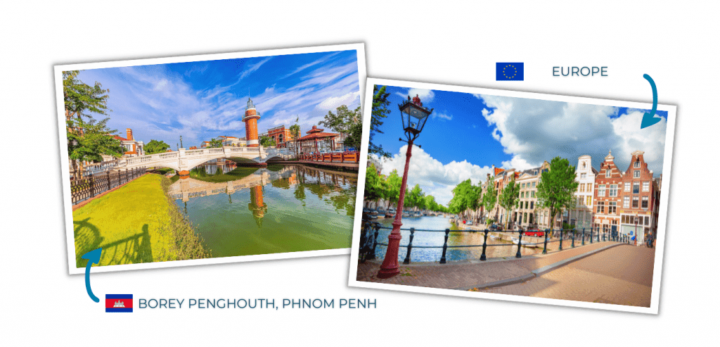 But you can scratch that out from your bucket list when you visit “Euro Park" in Borey Penghouth, also known as the little Europe in Cambodia. Entrance is for free; and it will only take you twenty (20) minutes from Phnom Penh town centre to experience a close-to-Europe tour. You’ll get to see Big Ben of UK, Eiffel Tower of Paris, Magere Brug bridge of Amsterdam, Arc de Triomphe of France, European-style ranch houses, and a watermill and windmill similar to those found in Netherlands—all in one park!