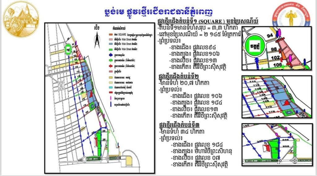 The “Phnom Penh Pedestrian Street” project was announced in April 2024 and is expected to change the face of the city. It will cover a massive 57 hectares in the core of Daun Penh , turning it into a lively pedestrian-only zone. The project will be finished by the end of 2024 and will have three different zones, each offering something special: