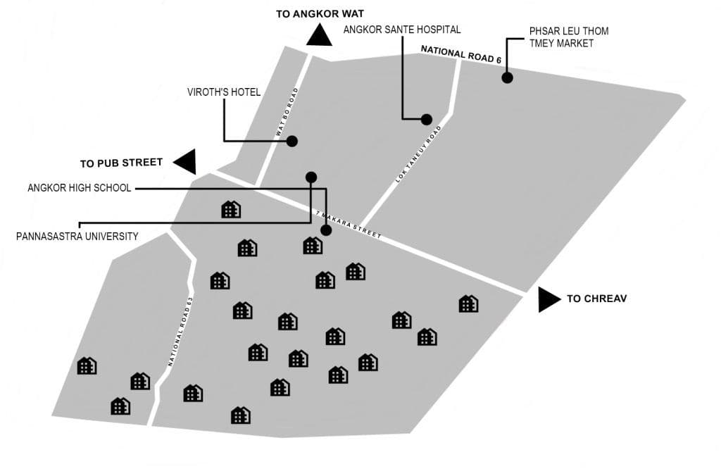 Sala Kamreuk is an urban commune east of Siem Reap’s Pub Street area across the river. Its northwestern landmark is the end of the bridge crossing Achar Sva Street, coming from the Apsara Statue Circle, extending around three (3) kilometers through National Road 6. It neighbors Chreav Commune on the southeastern boundary and includes portions of the west side of the river starting from Crow’s Nest Road and Road 63, moving southward about two (2) kilometers.
