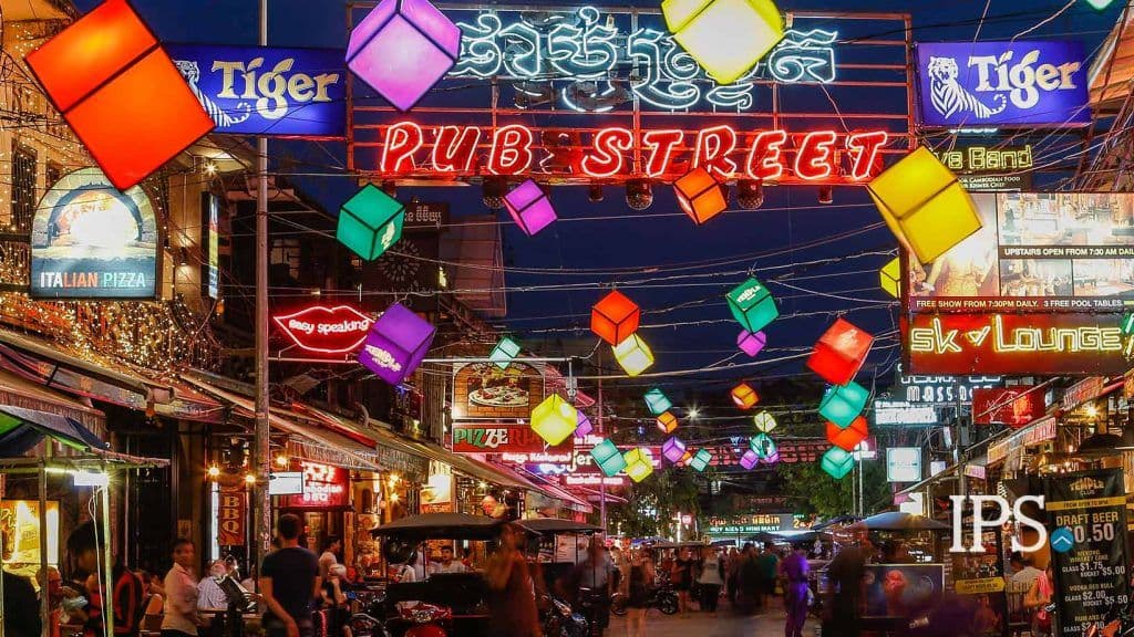 Siem Reap’s infamous Pub Street is a prime destination for tourists of all ages, who enjoy the mix of bars, restaurants and dance clubs after a long day at the temples. Famous for its 50-cent draft beers and cheap cocktails, it also boasts a broad mix of Khmer and western food, including Papier de Tigre (Paper Tiger), open since 1999 and features crocodile and ostrich on its extensive menu.